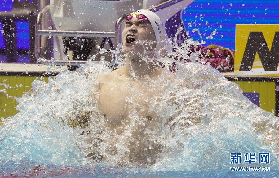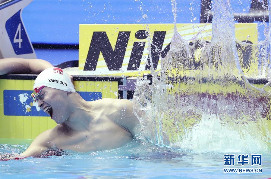 2019年7月21日,中国选手孙杨在韩国光州举行的2019国际泳联世界游泳锦标赛男子400米自由泳夺冠后庆祝。新华社记者白雪飞摄