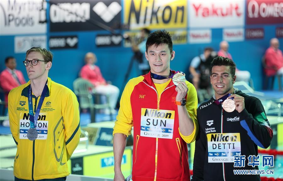 7月21日,中国选手孙杨(中)、澳大利亚选手霍顿(左)和意大利选手德蒂分获冠、亚、季军后参加颁奖仪式,然而霍顿并没有与他们一同登上领奖台。