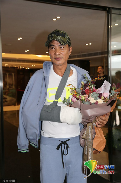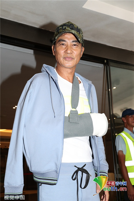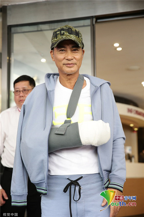 2019年7月24日,香港,任达华出院。他身穿蓝色运动外套走出医院,头戴鸭舌帽,受伤的右手则套上白色护臂带,面带笑容,精神状态非常好。