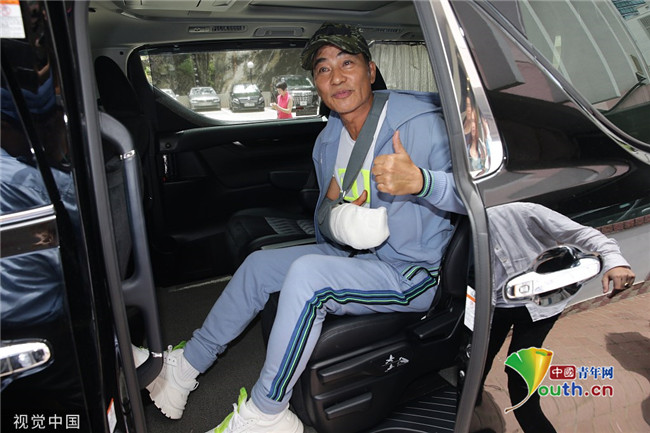 任达华出院 右臂绑绷带不忘竖拇指精神状态佳