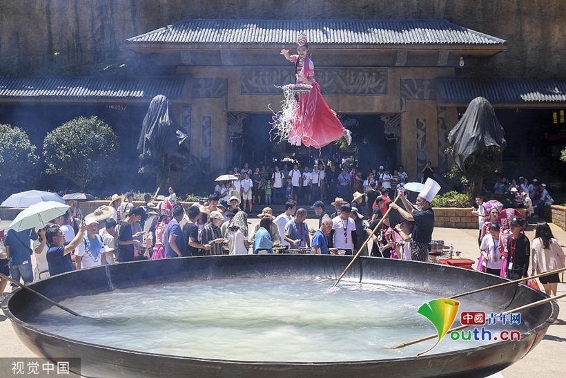 2019年7月24日,桂林一景区支起了一口面积达50平方米的巨型铁锅,女演员在10米高空向锅中下米粉,邀请游人免费品尝。图片作者:陈飞/视觉中国