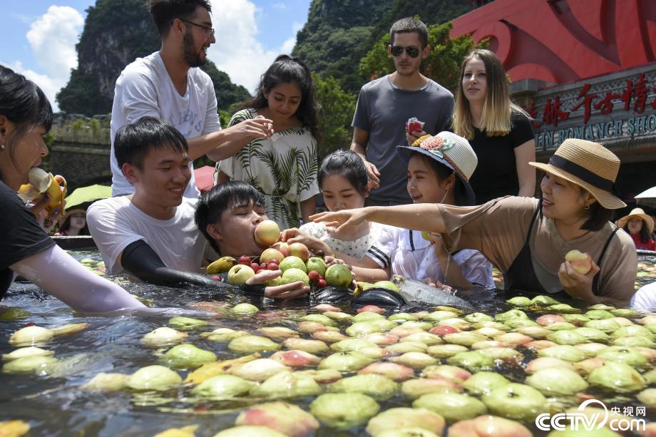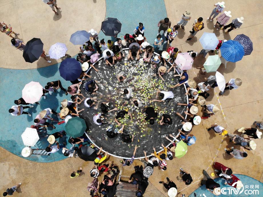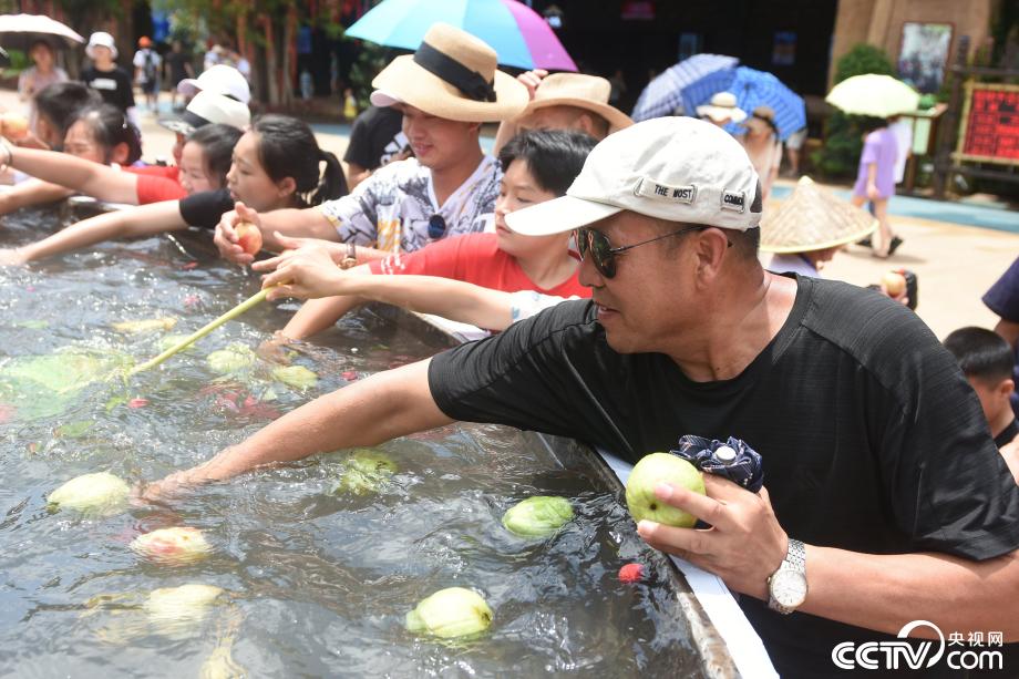 央视网消息:2019年7月25日,广西桂林千古情种植的水果大丰收,工作人员将水果放入巨型冰桶内冰镇,邀请众多游人走入冰桶中享用美味的水果,用这样的方式消暑降温。图片来源:视觉中国