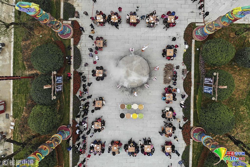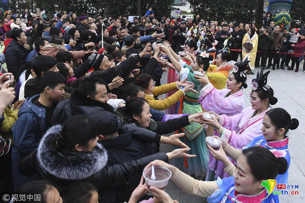 1月12日,中国农历腊八节前夕,江西宜春明月千古情景区用直径8米的巨型铁锅熬制了一锅重约10吨的苦菜粗粮腊八粥,邀请游客免费品尝,寓意忆苦思甜,珍惜现在来之不易的生活。