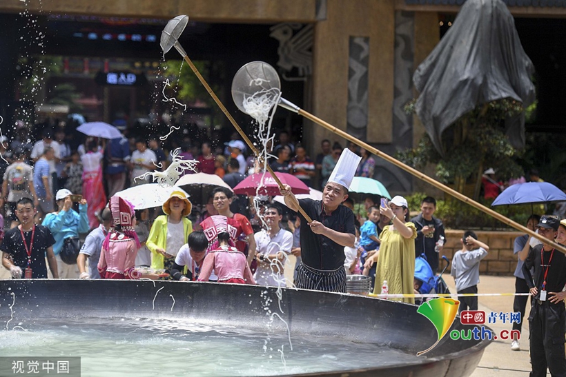 2019年7月24日,桂林一景区支起了一口面积达50平方米的巨型铁锅,女演员在10米高空向锅中下米粉,邀请游人免费品尝。图片作者:陈飞/视觉中国