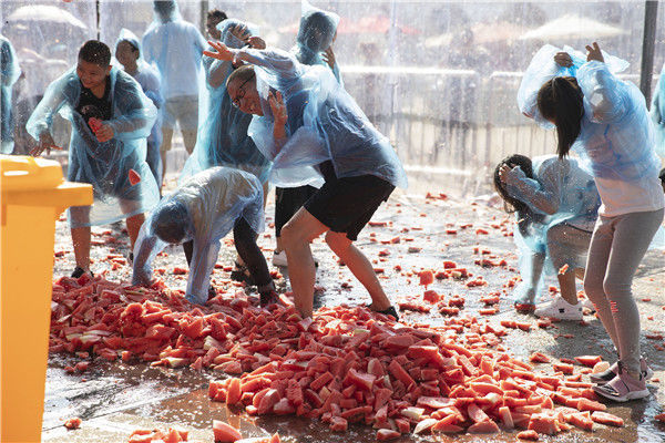 2018年10月5日,深圳,西瓜大赛开始,游客不停捡起在地上的西瓜扔向对方。