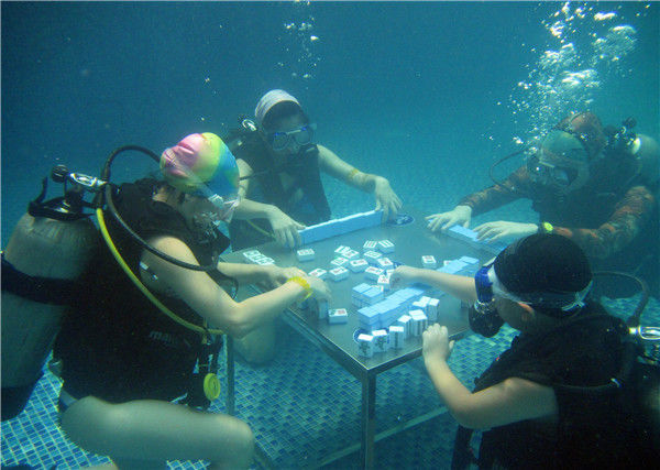 2016年7月17日,连续多日的高温让重庆主城开启了烧烤模式,为求清凉,爱好潜水的女麻友们为求清凉,竟将麻将桌搬到了水下,打起了“血战到底”的成都麻将,嗨翻水底。