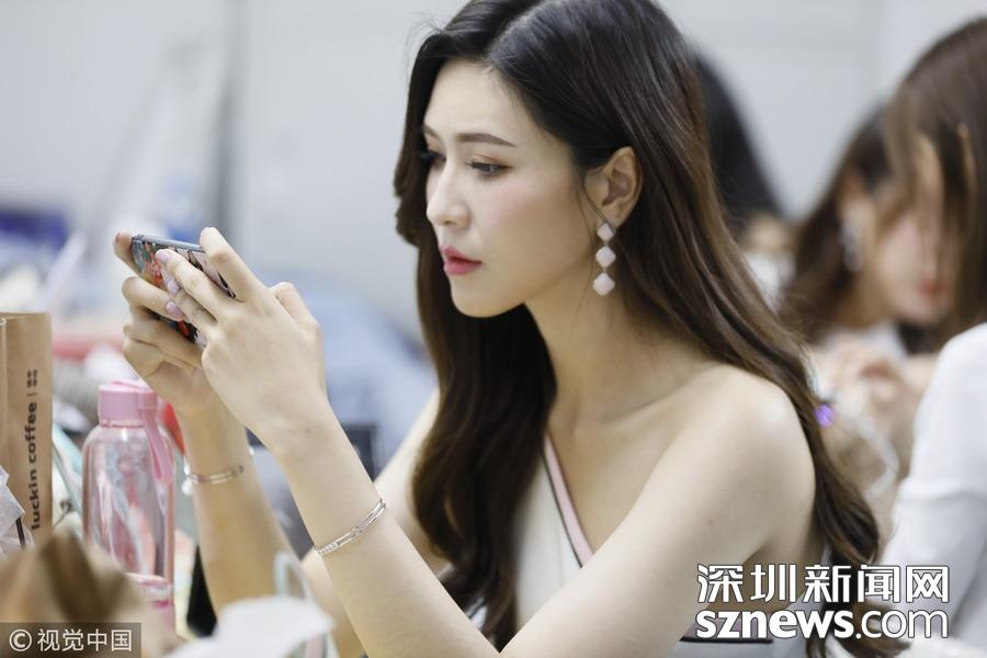 2018年11月16日,广州,第十六届中国(广州)国际汽车展览会媒体日。模特候场表演间隙,陈宏伟玩手机游戏