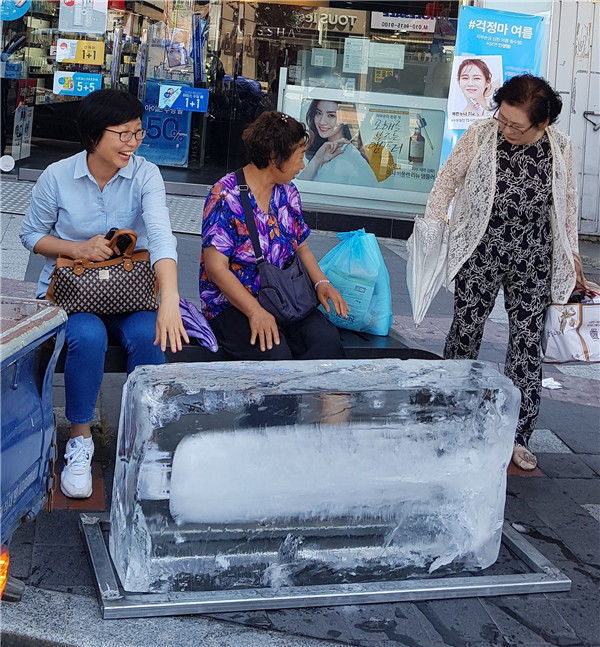 当地时间2018年8月9日,韩国金海市,为了帮助市民熬过酷暑,当地政府在21个公交车站放置了共150公斤冰块。