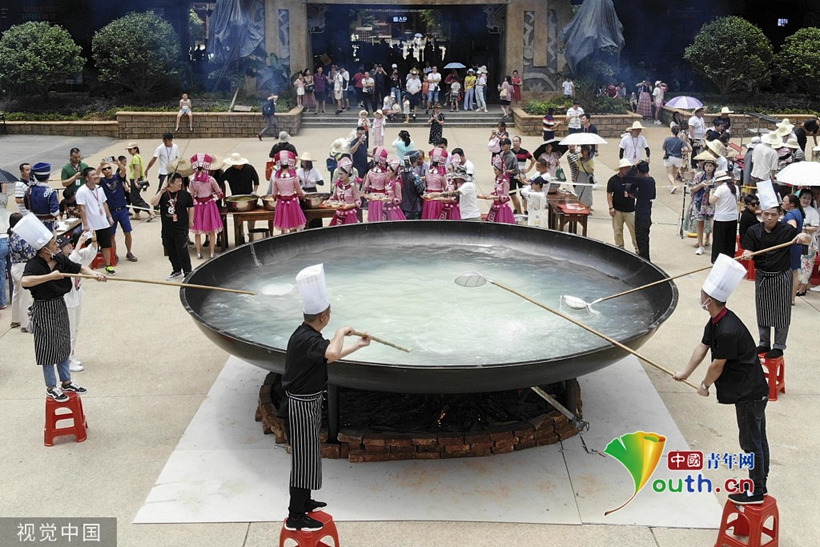 景区架50平米巨锅 “仙女”吊在锅正中下米粉