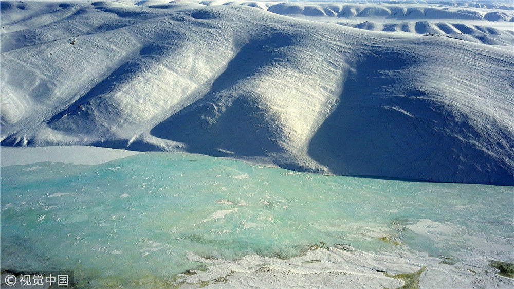 2019年2月19日,新疆开都河源头之一和静县查汗诺尔达坂段的河道冰雪开始融化景象(无人机拍摄)。