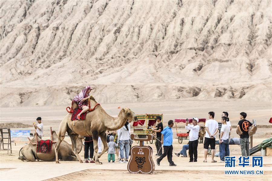 游客在新疆吐鲁番市火焰山景区观光游玩(7月15日摄)。炎炎夏日,天南海北的游客来到新疆,寻觅自然美景、感受人文风情。新华社记者赵戈摄