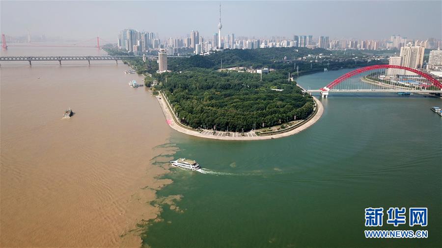 船只从汉江(右侧)驶入长江(左侧)水域(7月15日无人机拍摄)。