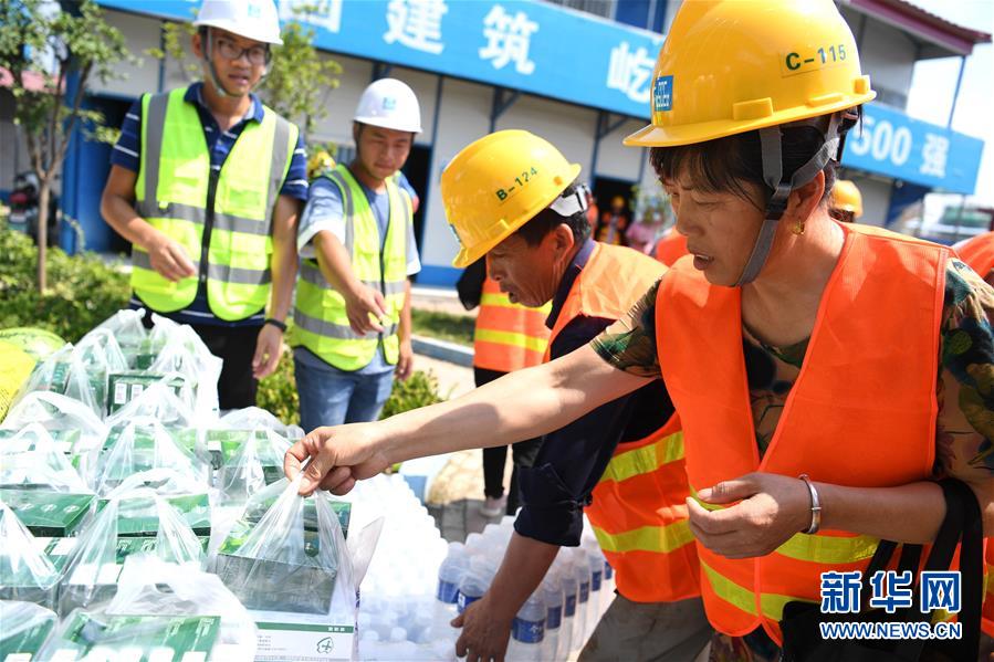 7月28日,中建五局安徽公司的建筑工人在合肥市的中安创谷项目工地上领取矿泉水、防暑药品等。 新华社记者 刘军喜 摄