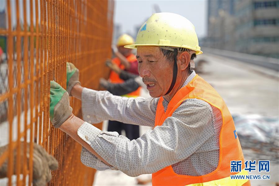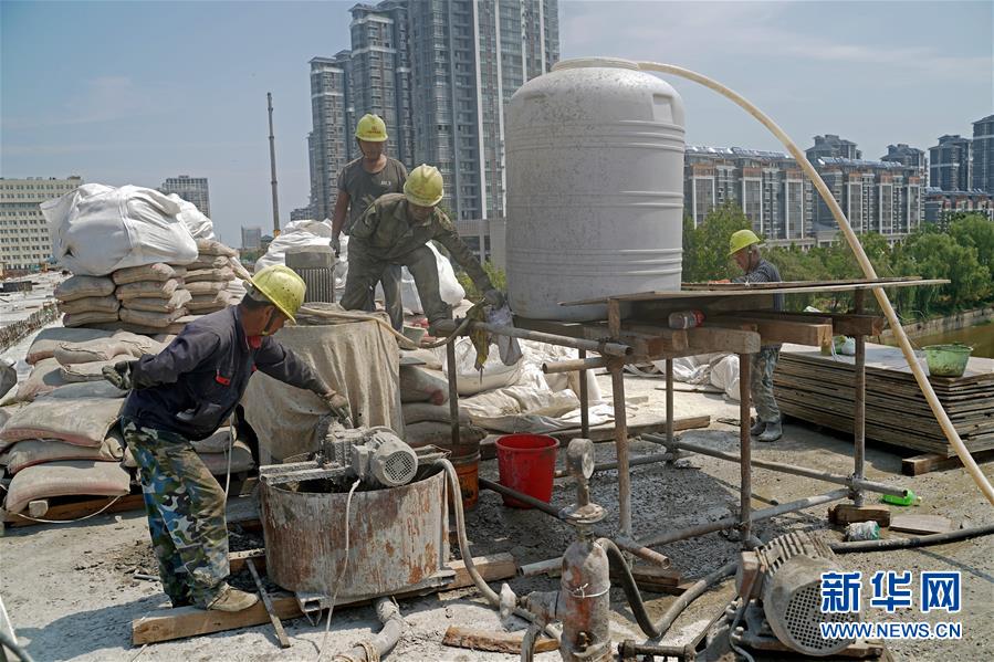 7月28日,工人在江苏省宿迁市泗洪县青阳南北大桥改造及城区部分路网提升工程工地上作业。 新华社记者 才扬 摄