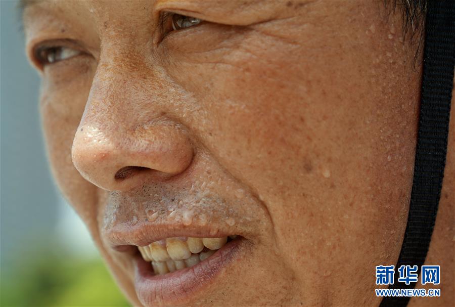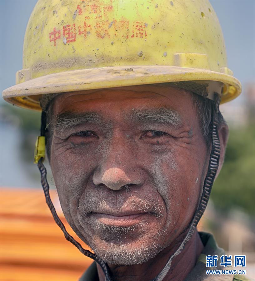 在江苏省宿迁市泗洪县青阳南北大桥改造及城区部分路网提升工程工地上,一名工人脸上的水泥灰混合了汗水(7月28日摄)。 新华社记者 才扬 摄