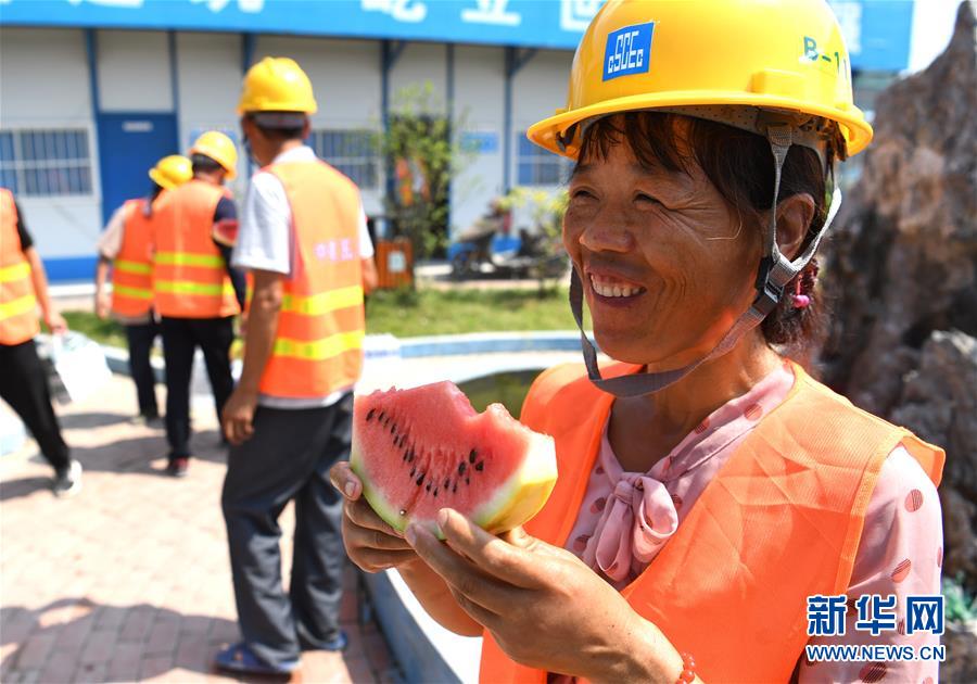 7月28日,中建五局安徽公司的建筑工人在合肥市的中安创谷项目工地上吃西瓜消暑。 新华社记者 刘军喜 摄
