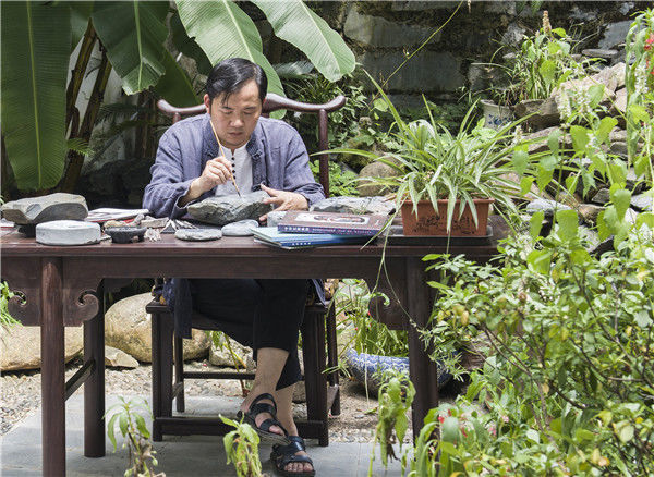 2019年7月28日,江西省婺源县江湾镇砚君楼,汪顺清在对砚台石勾画雕刻图案。