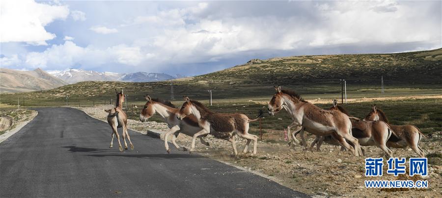 一群藏野驴在横穿马路(7月29日摄)。新华社记者 晋美多吉 摄