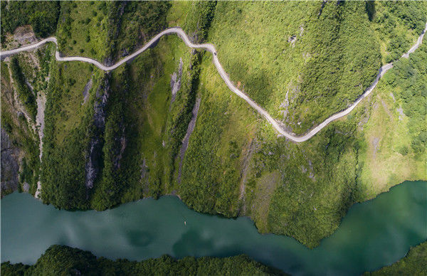 2019年7月27日,重庆,航拍黔江区阿蓬江镇两河社区至金洞乡早化村的“挂壁公路”。