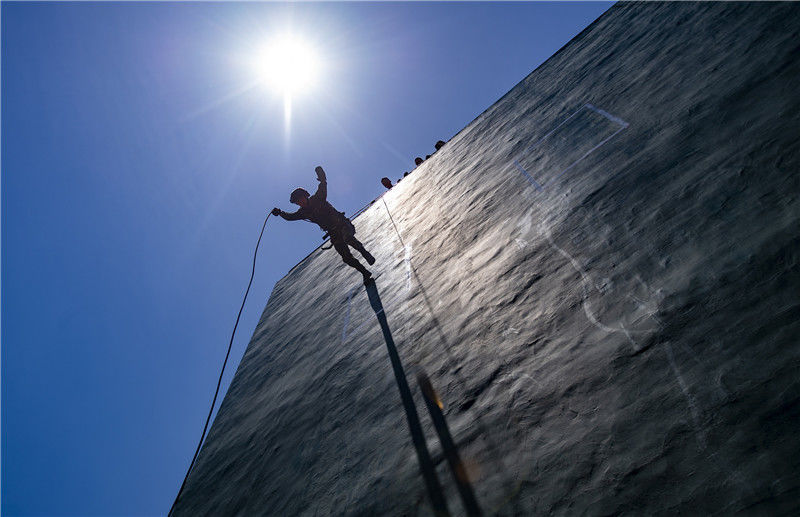 2019年7月30日,江西新余,武警官兵在高新区某训练基地冒着酷暑训练。武警江西总队新余支队组织开展单兵战术技能、综合体能、楼房反劫持战斗、房间突入、攀登索降、400米障碍等科目训练,全面锤炼实战能力。赵春亮/视觉中国 编辑/陈进