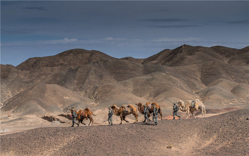 2019年5月9日,内蒙古阿拉善盟,边防官兵同骆驼一起巡逻。连队建立之初,巡逻任务都是靠骑骆驼完成的,如今连队为边境巡逻配备了汽车,但战士们依旧保留着骑骆驼执勤的传统。