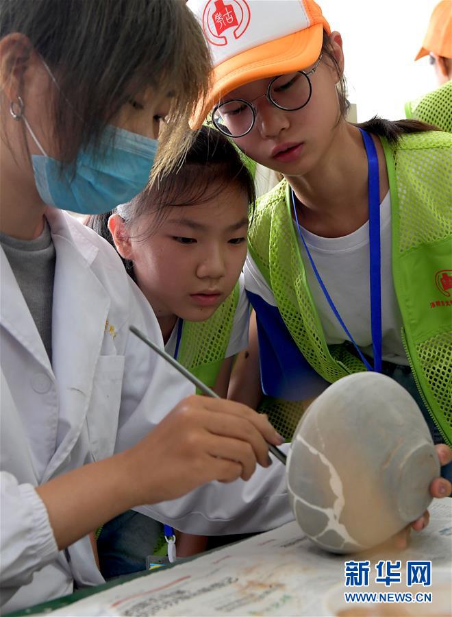 8月1日,洛阳市“我是小小考古家”夏令营的营员们在洛阳市文物考古研究院文物保护修复中心观看工作人员修复文物。 当日,河南省洛阳市“我是小小考古家”夏令营的70余名营员走进曹魏大墓考古工地、洛阳市文物考古研究院文物保护修复中心,通过参观体验近距离感受真实的文物考古工作,领略古都洛阳厚重的历史文化。 新华社记者 李安 摄
