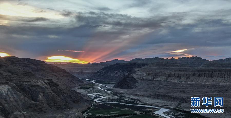 夕阳余晖下,古格王国遗址旁的河流(7月30日无人机拍摄)。 新华社记者 晋美多吉 摄