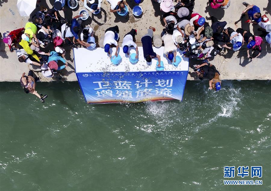 8月3日,首届福清开渔节增殖放流活动上人们在向大海投放鱼苗(无人机拍摄)。