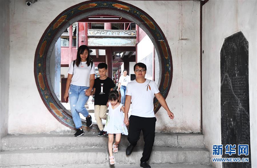 游客在张飞庙游览(7月31日摄)。云阳县城搬迁时,原在老城对岸的张飞庙,也一砖一瓦地搬迁到了与云阳新县城一江之隔的新址。