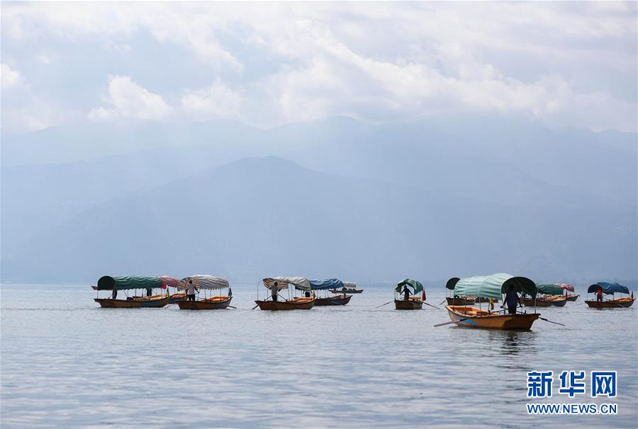 7月27日,西昌邛海的渔民乘着渔船准备捕鱼。