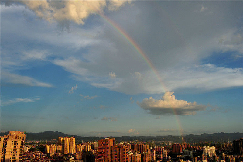 2019年8月1日,浙江金华,受今年第7号台风韦帕的外围影响,金华城市上空彩云飞舞,当天傍晚时分,在下了点零星小雨后,在天空的东边出现了一道漂亮彩虹,与绚丽晚霞交相辉映。时补法/视觉中国