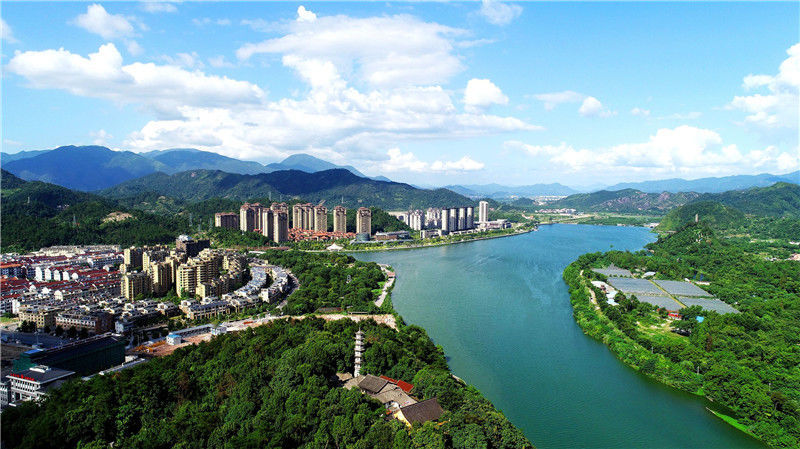 2019年8月1日,浙江台州,在蓝天白云映衬下的浙江仙居新区,高楼林立、绿树掩映、青山环抱、碧水绕城,景美如画。王华斌/视觉中国