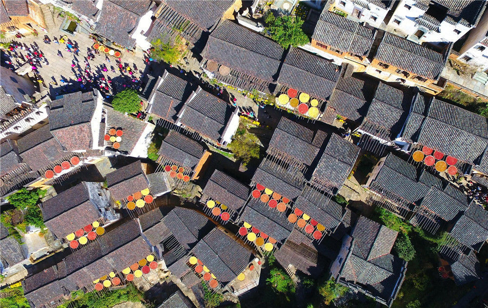 2018年10月28日,江西上饶,航拍婺源县篁岭村独特的“晒秋”农俗景。篁岭村位于江西省上饶市婺源县东北部。金秋十月,整个山间村落徽式民居土砖外墙与晒架上色彩缤纷。 刘占昆(江西分社)/中新社/视觉中国