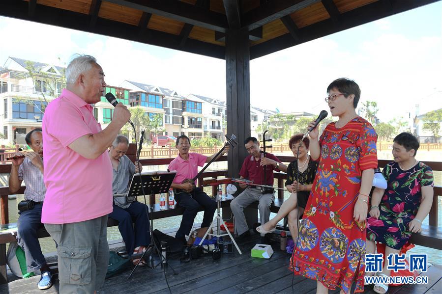 8月5日,埭溪镇小羊山村村民在村里的水上凉亭唱越剧。新华社记者 翁忻旸 摄