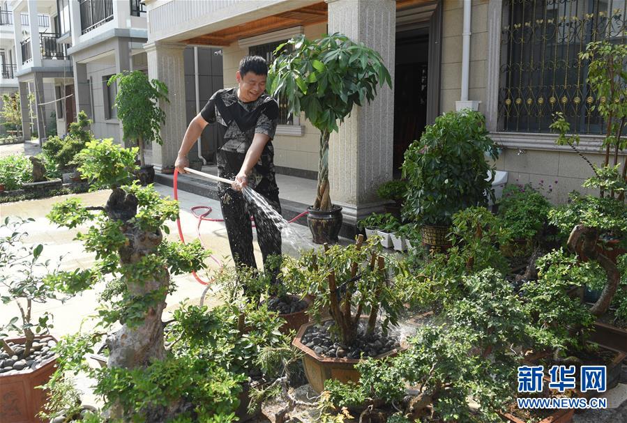 8月5日,埭溪镇小羊山村村民在自家庭院浇水。新华社记者 翁忻旸 摄