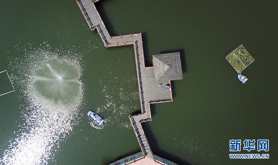 8月5日,埭溪镇小羊山村保洁员对河塘进行清理(无人机拍摄)。新华社记者 翁忻旸 摄