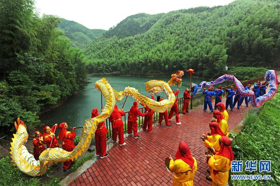 7月23日,浙江省安吉县山川乡大里村农民舞龙队在彩排“双龙戏珠”节目。 新华社记者 谭进 摄