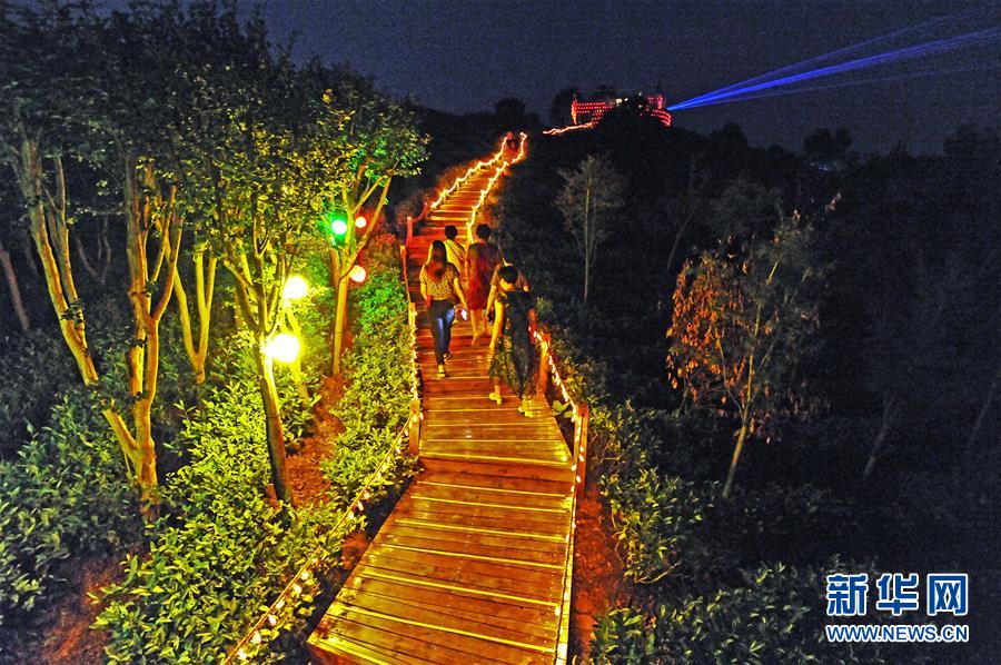游客在欣赏浙江省安吉县灵峰街道剑山村蔓塘里自然村的“大地之光”艺术光影秀(7月20日摄)。 新华社记者 谭进 摄