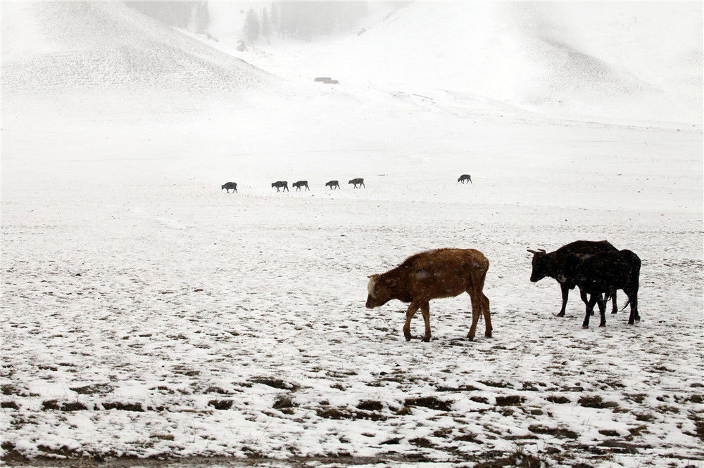 2017年5月1日,新疆哈密,东天山一带大雪飘飞,青青草原上铺上了一层厚厚的积雪,山上白雪皑皑,山下如烟如雾,煞是好看,但最低气温从四月底的14℃降至0℃左右,给出行以及部分设施农业造成影响。孙继虎/视觉中国