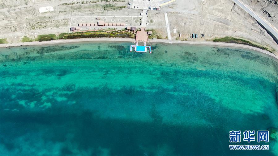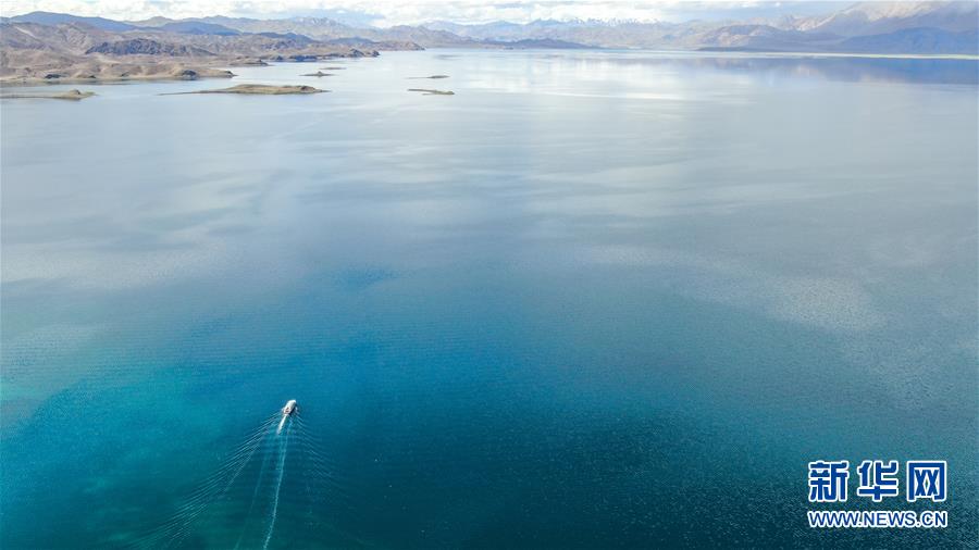 从空中鸟瞰班公湖(8月3日无人机拍摄)。班公湖位于西藏阿里地区日土县,它的奇特之处在于,由东向西水中含盐量递增。湖中分布着10余个岛屿,有游船供游人环湖观光。新华社记者 晋美多吉 摄