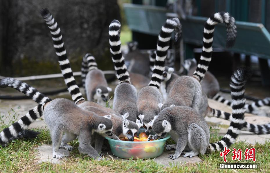 8月6日,众多环尾狐猴在抢食水果冰。连日来,浙江杭州高温天持续,杭州野生动物世界的华南虎、大熊猫等珍稀动物通过遮阳、享用冰食等消暑。中新社记者王刚摄