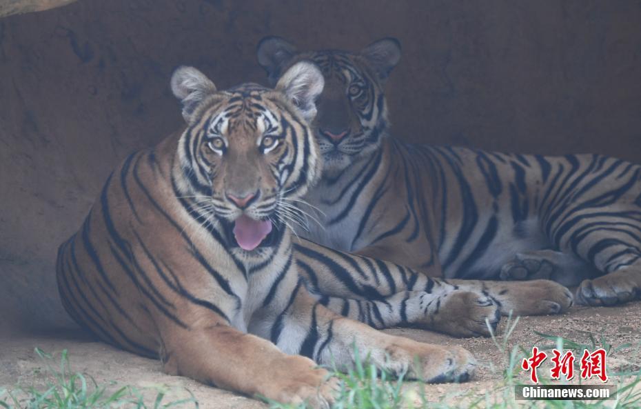连日来,浙江杭州高温天持续,杭州野生动物世界的华南虎、大熊猫等珍稀动物通过遮阳、享用冰食等消暑。图为两只华南虎在阴凉处休息。中新社记者王刚摄