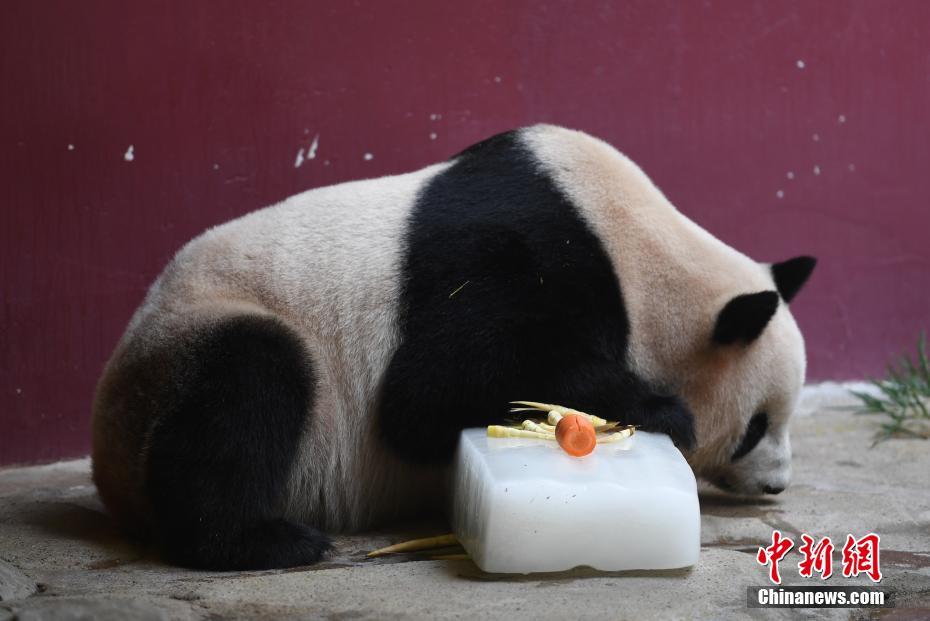 连日来,浙江杭州高温天持续,杭州野生动物世界的华南虎、大熊猫等珍稀动物通过遮阳、享用冰食等消暑。图为一只大熊猫趴在冰块上纳凉。中新社记者王刚摄