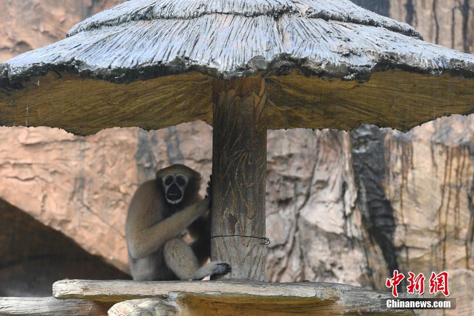 连日来,浙江杭州高温天持续,杭州野生动物世界的华南虎、大熊猫等珍稀动物通过遮阳、享用冰食等消暑。图为一只长臂猿在“巨伞”下乘凉。中新社记者王刚摄