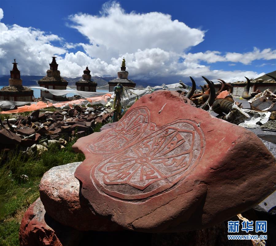 当惹雍错旁的象雄佛塔及经石(8月5日摄)。西藏那曲市尼玛县位于西藏西北部,位于羌塘国家级自然保护区内,是古老象雄文明的发祥地之一。这里空气洁净,野生动物繁多,深受游客喜爱。新华社记者觉果摄