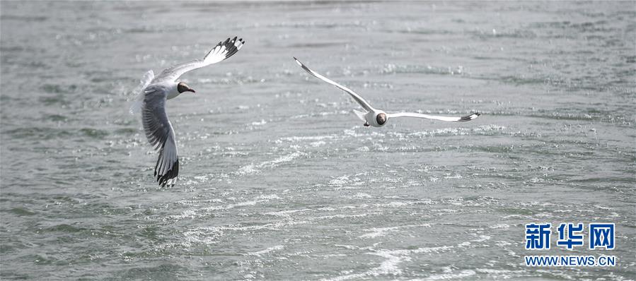 班公湖上飞翔的棕头鸥(8月3日摄)。 班公湖位于西藏阿里地区日土县西部,湖面平均海拔4200米,湖中有数个岛屿,每年有数万只鸟到湖上的小岛上栖息繁殖。 新华社记者 晋美多吉 摄