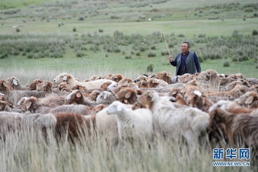 在新疆阿勒泰地区福海县牧区,牧民在山坡上放羊(6月7日摄)。新华社记者丁磊摄