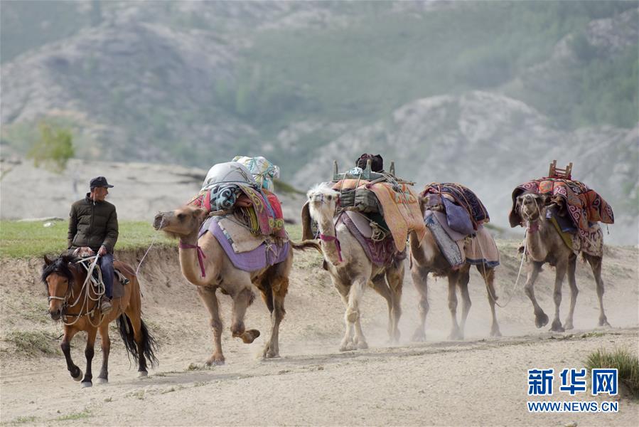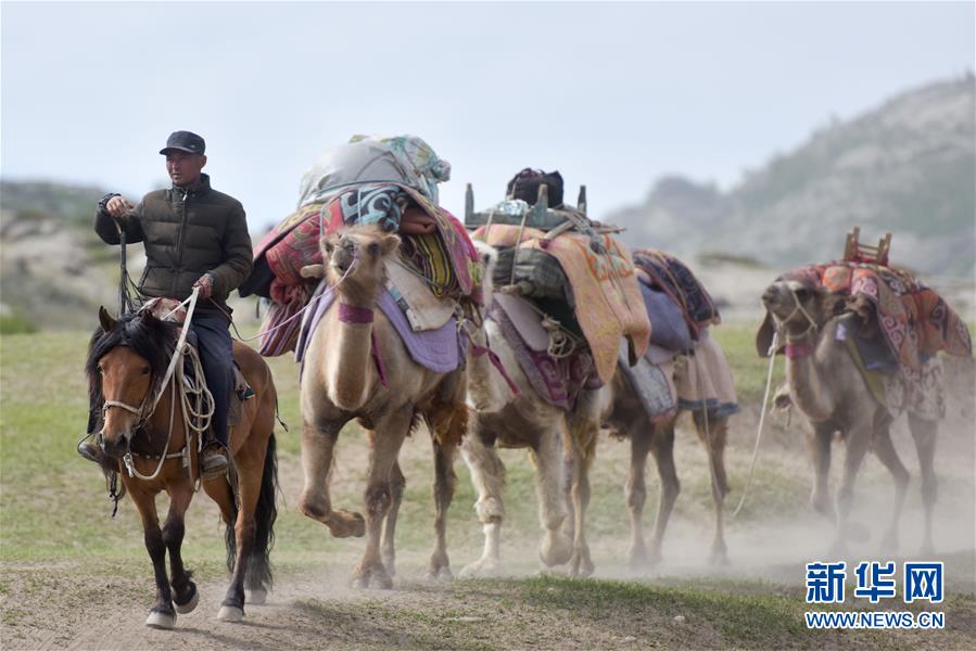 6月6日,新疆阿勒泰地区福海县牧民带着驼队行进在转场途中。 新华社记者 丁磊 摄