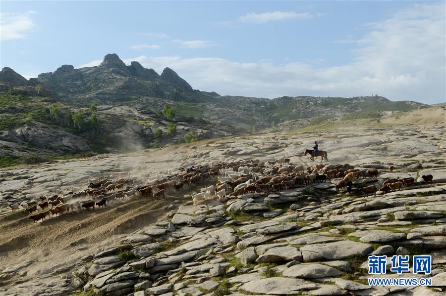 6月6日,新疆阿勒泰地区福海县牧民赶着转场牲畜翻越山头。 新华社记者 丁磊 摄