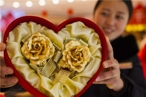 2015年2月9日,江苏连云港赣榆区一家金店的营业员展示黄金玫瑰。